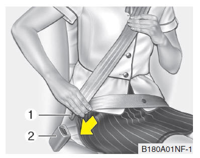 Steek de metalen gesp (1) van de tweepuntsheupgordel in de gordelsluiting (2).Wanneer de gesp in de gordelsluiting vergrendelt, is een klik hoorbaar.