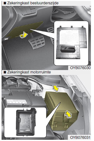 Aan de binnenzijde van de deksels vindt u een label met daarop de naam van de zekeringen en relais en de capaciteit.