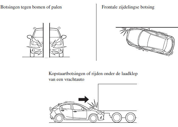 Beperkingen ten aanzien van de detectie van frontale/bijna frontale botsingen: In de volgende illustraties worden voorbeelden gegeven van frontale/bijna frontale botsingen die mogelijk niet als ernstig genoeg bespeurd worden om de SRS airbaguitrusting te activeren.