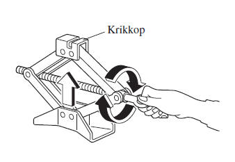 8. Draai de krikhendel rechtsom en krik de auto zodanig omhoog dat het reservewiel gemonteerd kan worden.